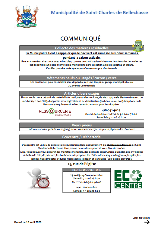 Pour répondre au Règlement du Ministère de la Sécurité publique portant sur les procédures d’alerte et de mobilisation en cas de sinistre, nous tenons à informer nos citoyennes et citoyens